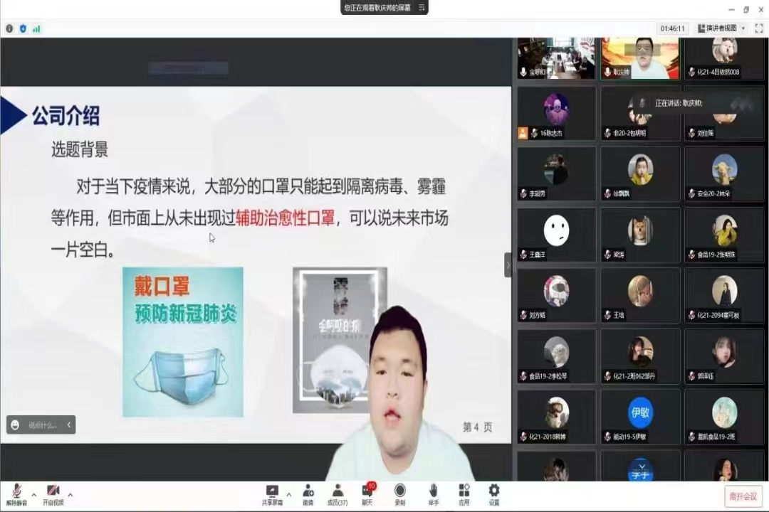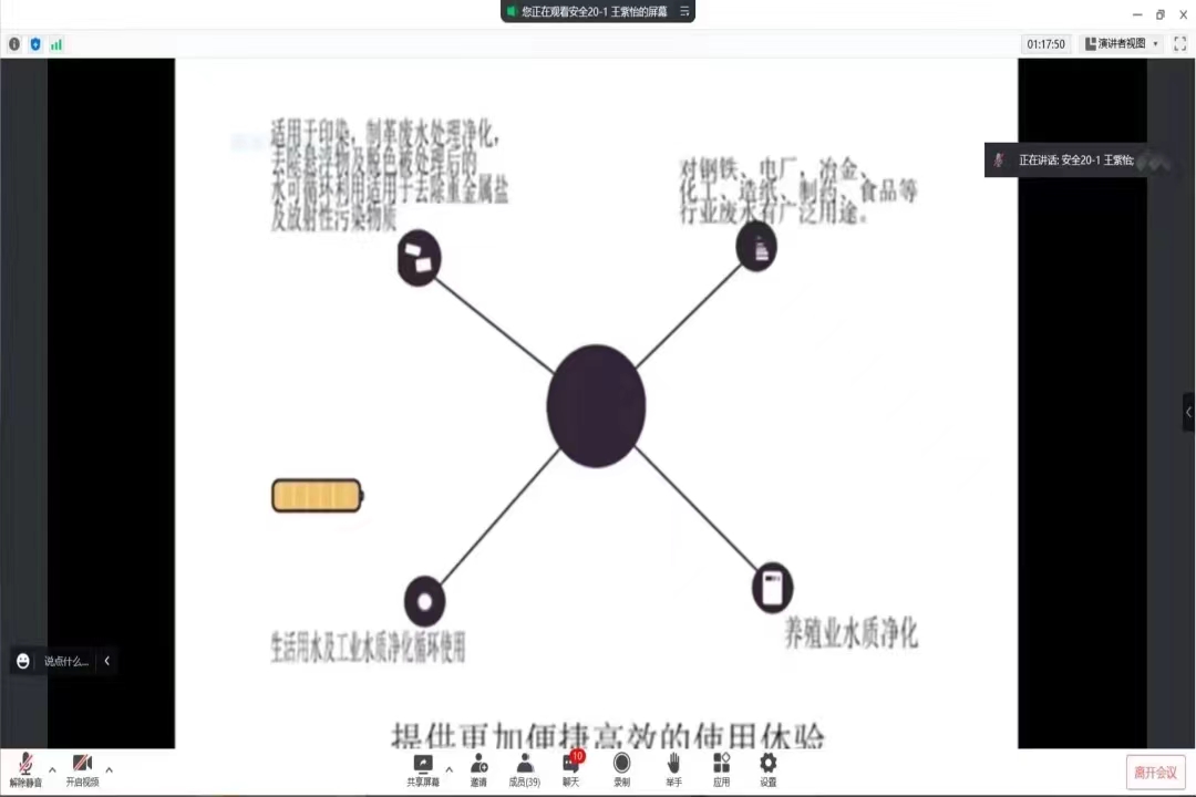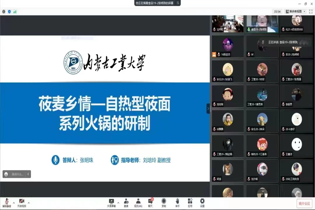 员工以线上腾讯会议的形式进行路演答辩,经过学院专家组初审共有六组项目成功进入路演答辩环节。经过激烈的角逐和专家组的认真研讨,最终确定来自食品科学与工程19级2班的张明珠同学的《自热型莜面系列火锅的研制》项目以及来自安全工程专业20级1班的王紫怡同学的《“废”起乌金——水处理“人工”新思路》项目将代表学院继续参加校赛。
