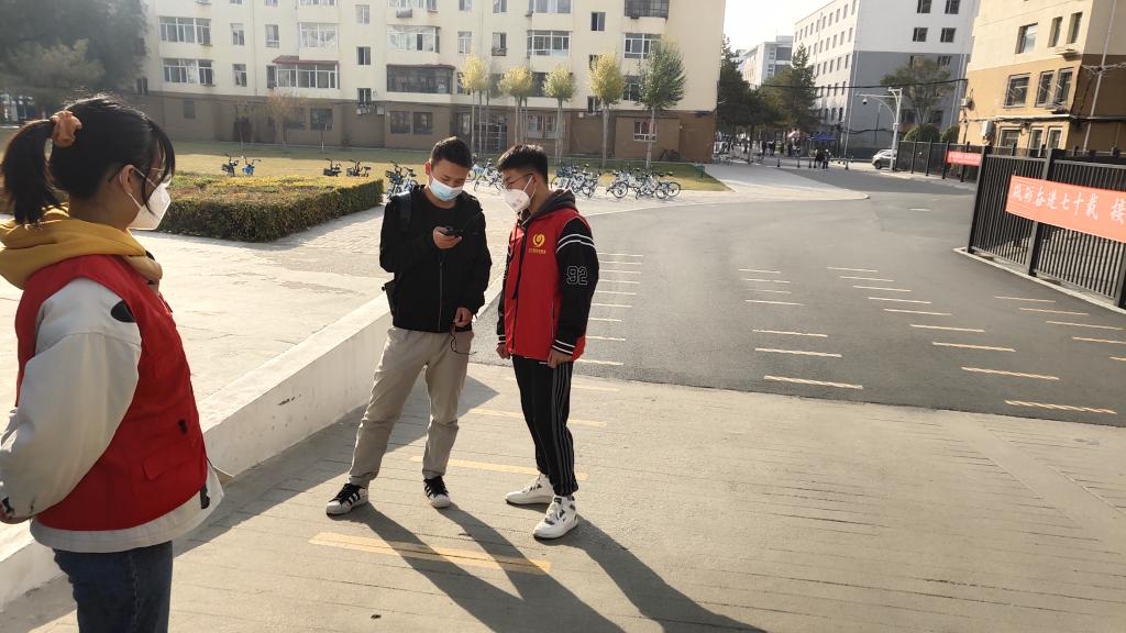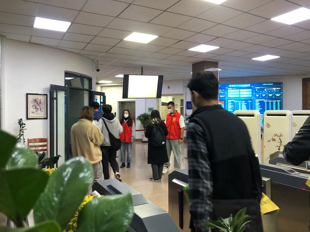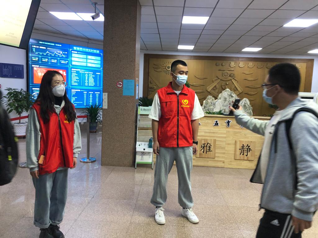 从早晨七点半到晚上七点,40多名党员、发展对象分成十组在两个地点轮替值班。他们身着党员志愿者服装,在图书馆人流量高峰期引导同学们严格执行“预约入馆”制度,并提醒同学们在馆期间须全程佩戴口罩等疫情防控下的入馆要求。在北区入口处对进出人员进行体温检测及健康码和校园卡等相关证件的检查。