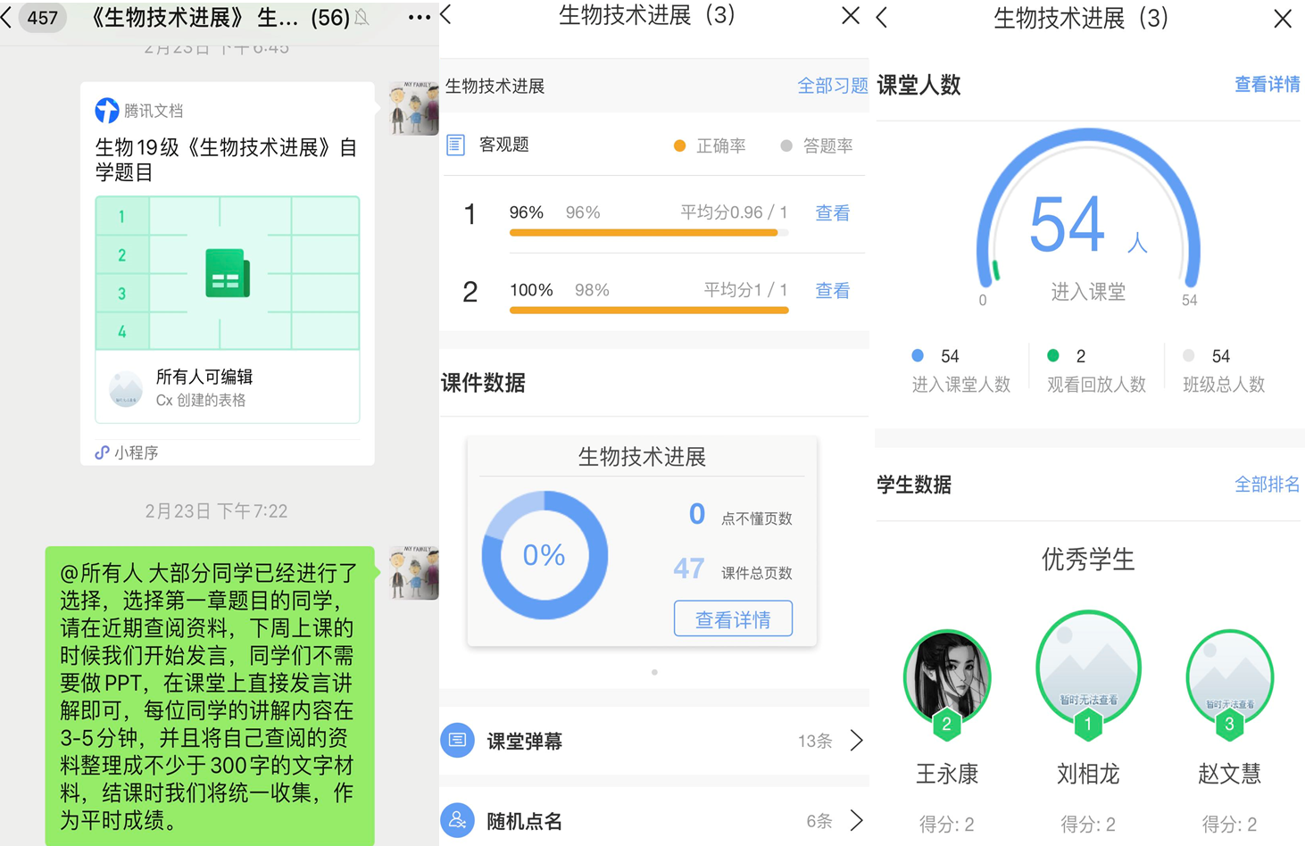 根据学校《关于做好暂缓返校期间线上教学质量保障工作的通知》和学院教学工作总体安排,我们再次启动了跨越时空的线上教学模式。虽然有2020年网络教学经验,这一次我们多了几分从容,但也丝毫不敢松懈。因为在这个信息高速发展的时代,两年的时间又会涌现出大量新的理念与技术唯有不断学习才能跟得上时代的步伐。从接到任务起,我便积极响应学校“确保疫情防控期间教学进度和教学质量”的号召,及时关注学校组织的在线教学技术交流信息,学习最新的教学软件与技能。在对学校推荐的多种在线教育平台进行比较以及与员工经过多种连线尝试后,最终选择“腾讯会议+雨课堂+微信群”模式进行直播教学。利用腾讯会议交流方便、高效的优点及回放功能,增加课堂互动流畅,提高员工的参与热情,方便员工课下复习。开启“雨课堂”的课堂检测、随机点名、弹幕、课后资源共享等功能,确保教学进度及教学效果不受影响。通过“微信群”发布课前预习清单、通知及线上答疑,能够实现员工的无障碍交流。同时,为防止软件出现卡顿现象,以“钉钉”及“微助教”作为备选教学平台。