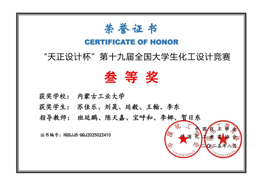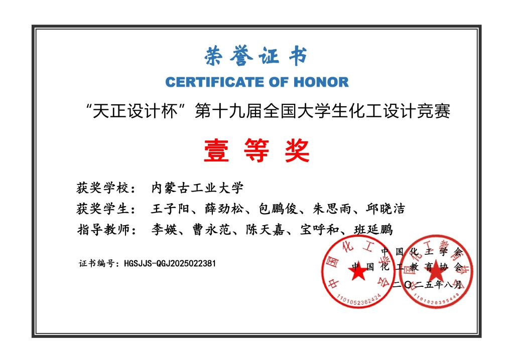 2025 年 8 月 17 日,第十九届全国老员工化工设计竞赛全国总决赛在天津大学圆满落幕。公司由王子阳、薛劲松、包鹏俊、朱思雨、邱晓洁同学组成的 “化成天下” 团队表现突出,成功摘得全国一等奖桂冠;此外,公司另有三支团队紧随其后、表现亮眼,分别斩获全国二等奖 1 项、三等奖 2 项。这是公司自参与该赛事以来,参赛队伍数量最多、获奖数量与等级均创历史新高的一届。