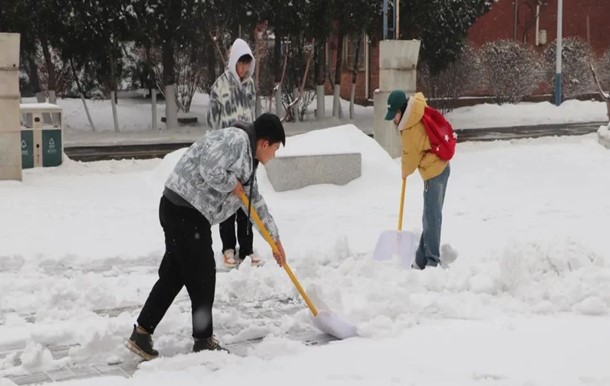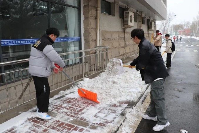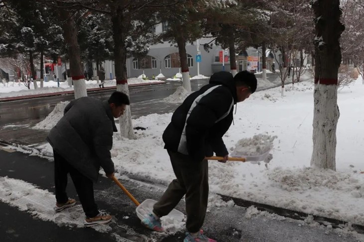 活动中,志愿者积极配合学校的安排,使得活动有条不紊的进行。一个个志愿者们在一片皑皑冰雪中铲雪的动作格外醒目。大家有的持铁锹,有的拿扫把,齐心协力,推雪铲冰,热火朝天地投入到清扫校园积雪的行动中。