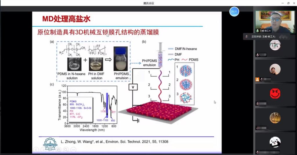 王威教授针对原位制造的具有3D机械互锁膜孔结构的疏水气态膜及其高盐水浓缩、铠甲结构连通孔疏水气态膜及其铵回收与净水研究、具有选择性溶解-扩散作用的光热高分子膜用于太阳蒸馏制水等内容作了深入介绍,对师生提出的问题进行了详细解答。