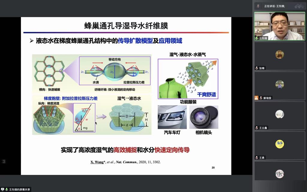 5月30日下午,学院与科研处共同举办线上学术报告会。会议邀请东华大学研究员、博士生导师王先锋以“智能热湿管理微纳米纤维纺织品”为题作了精彩的报告。