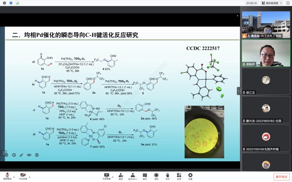 包永胜教授围绕多相Pd催化的C-H键活化反应研究、均相Pd催化的瞬态导向C-H键活化反应研究、Cu/O2催化的酰胺C-C键活化反应研究、基于Pd催化方法学的LED材料研究等内容作了深入介绍,对师生提出的问题进行了详细解答。