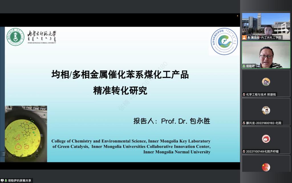 12月1日下午,学院与科研处共同举办线上学术报告会。会议邀请内蒙古师范大学化学与环境科学学院副经理、教授、博士生导师包永胜以“均相/多相金属催化苯系煤化工产品精准转化研究”为题作了精彩的报告。