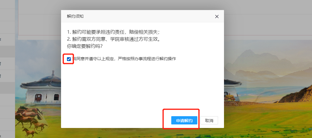 在单位的解约通知处可进行“同意”或“暂不处理”的操作,如点击同意则会有二次确认的弹框显示,确认后解约完成。如点击暂不处理则返回上一页面。