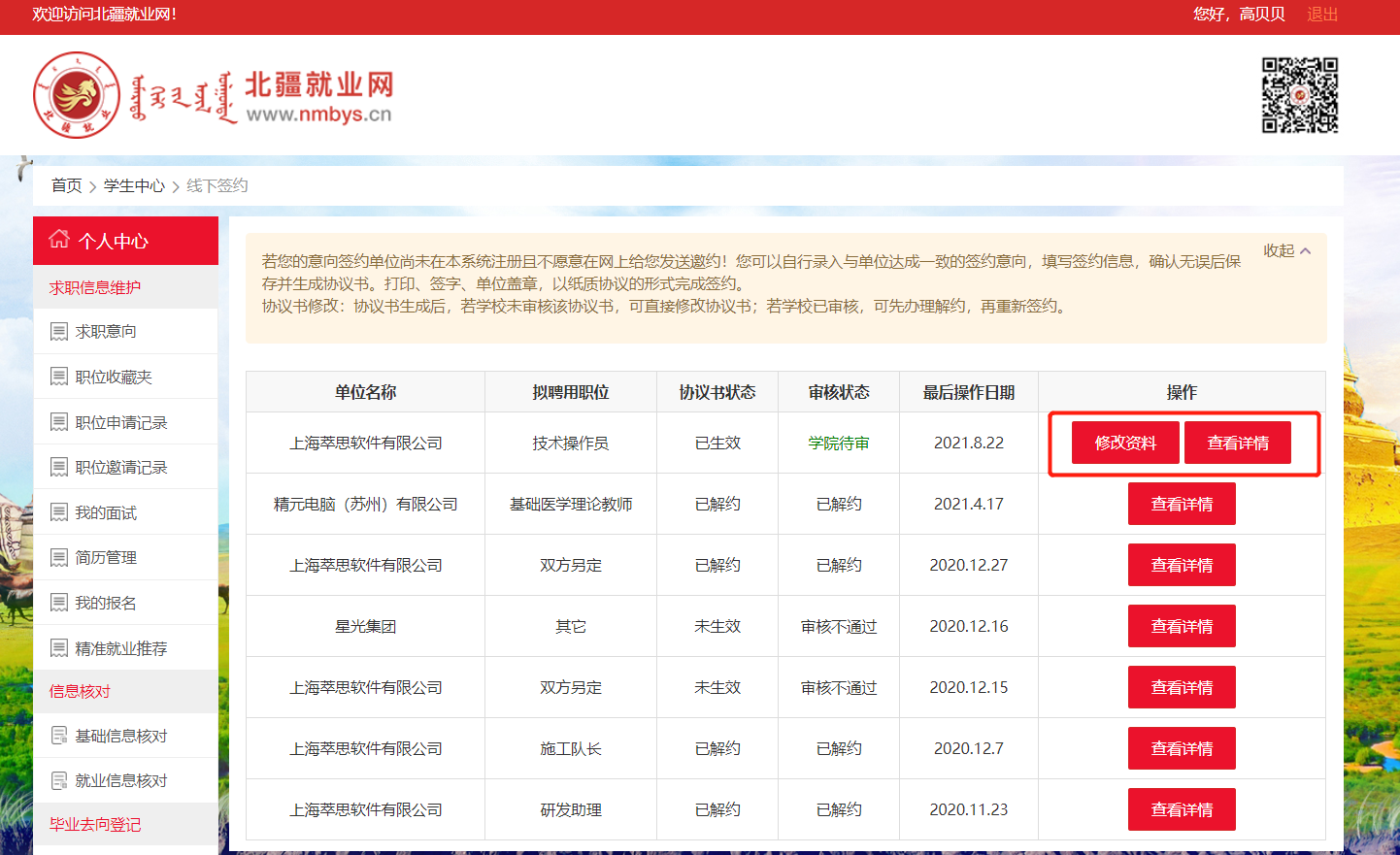 操作后,员工回到签约邀请列表,可持续关注老师审核的结果,如下图:签约审核通过,则此次签约完成,形成就业信息。审核不通过,员工可继续同其他单位签约。