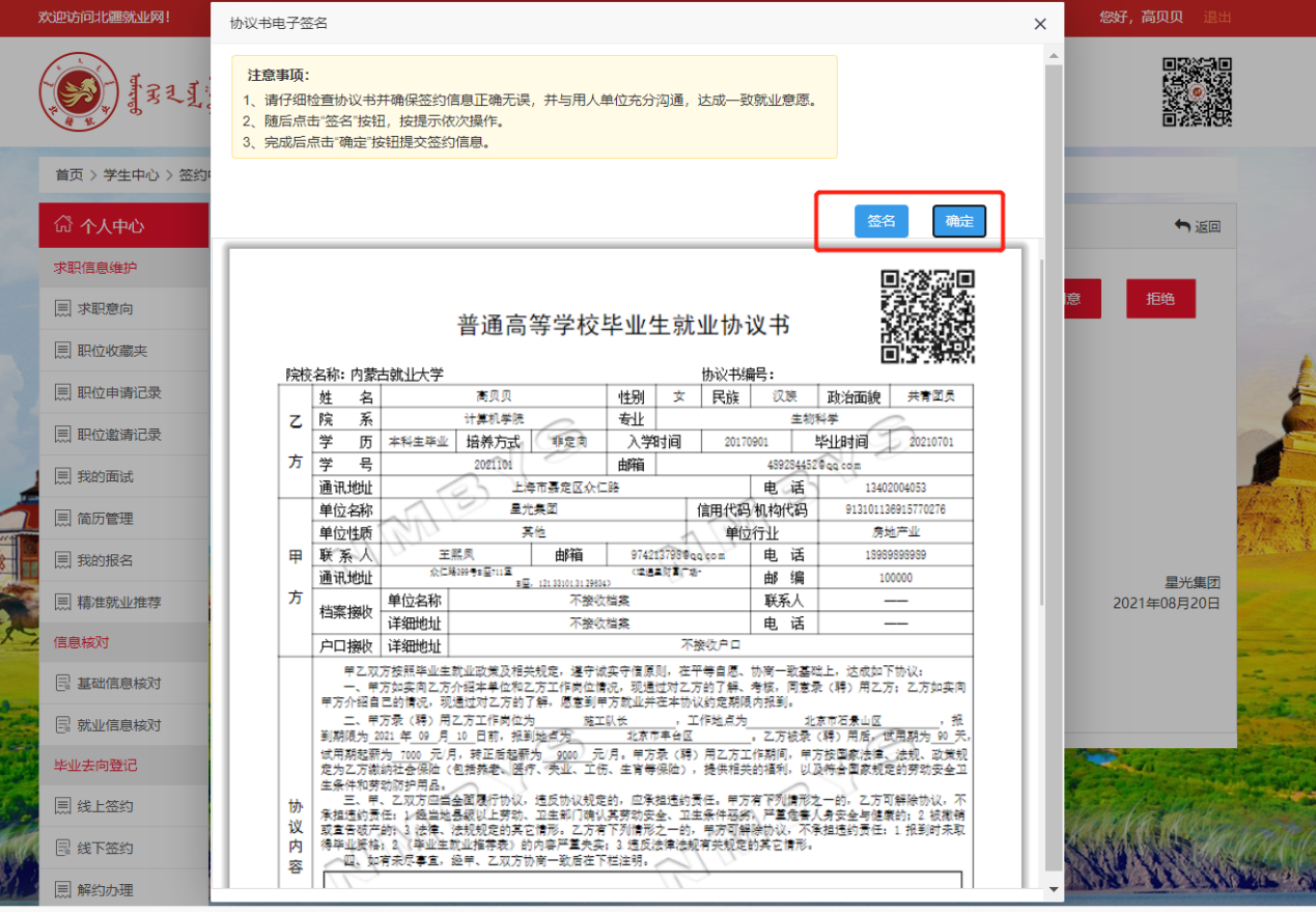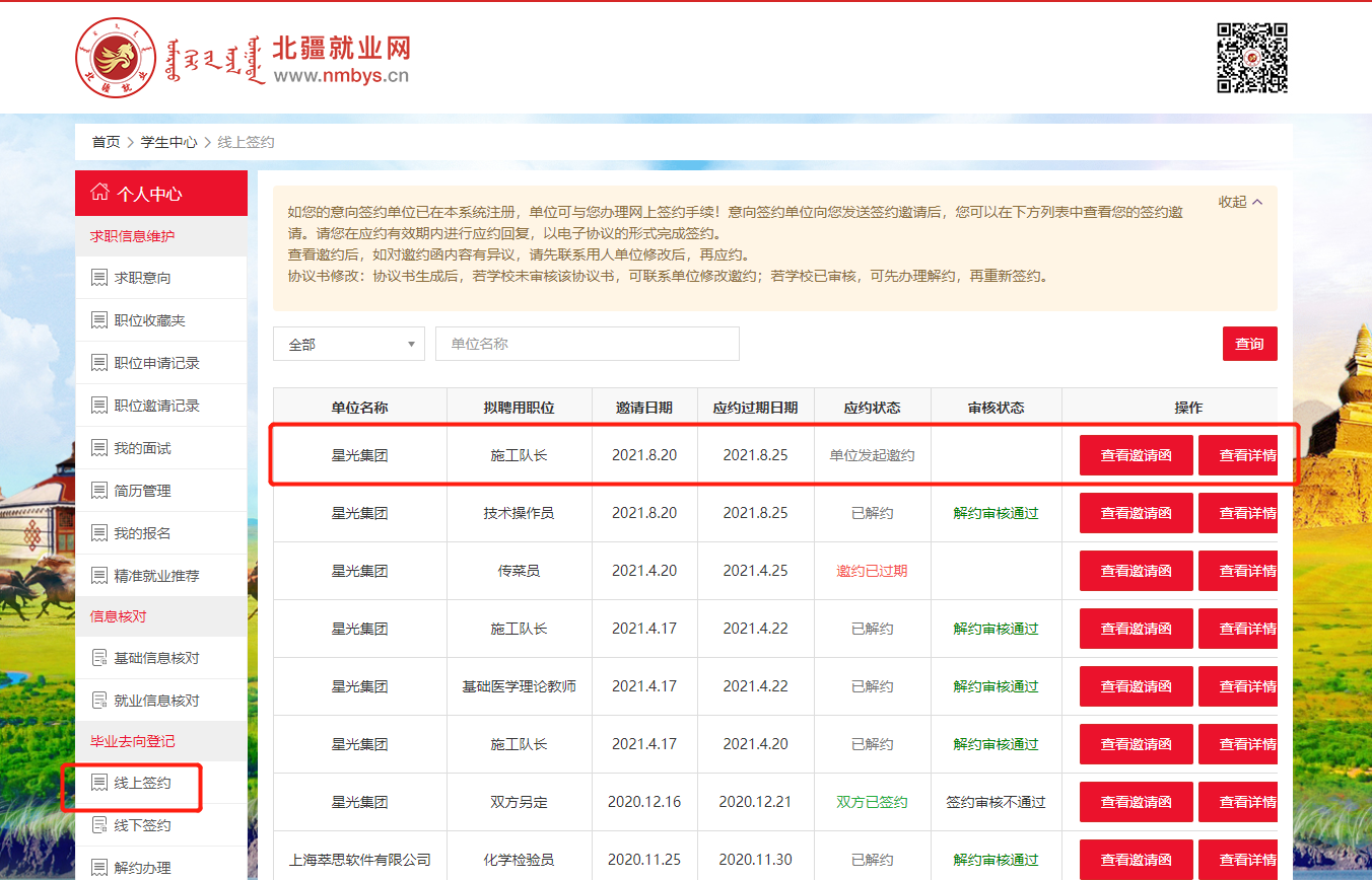 若拒绝与单位签约,则在邀请函里点击“拒绝”按钮,此次签约已拒绝。