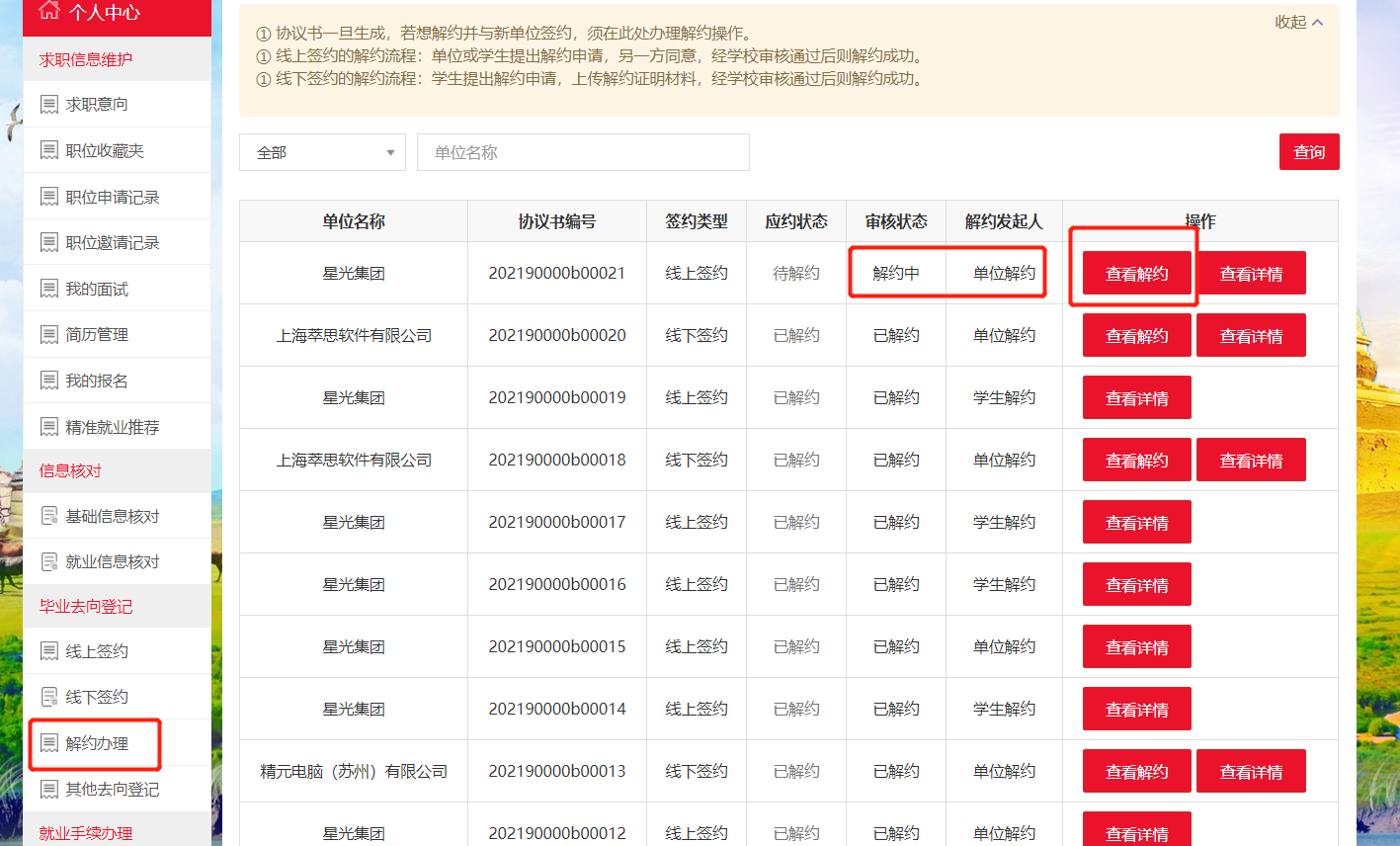 员工在个人中心-解约办理模块可以看到当前单位申请解约的信息。点击“查看解约”可看到单位的解约原因。
