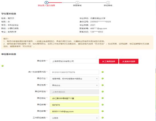 员工在个人中心->毕业去向登记->线下签约模块,点击“录入协议书”按钮,进入信息编辑界面。