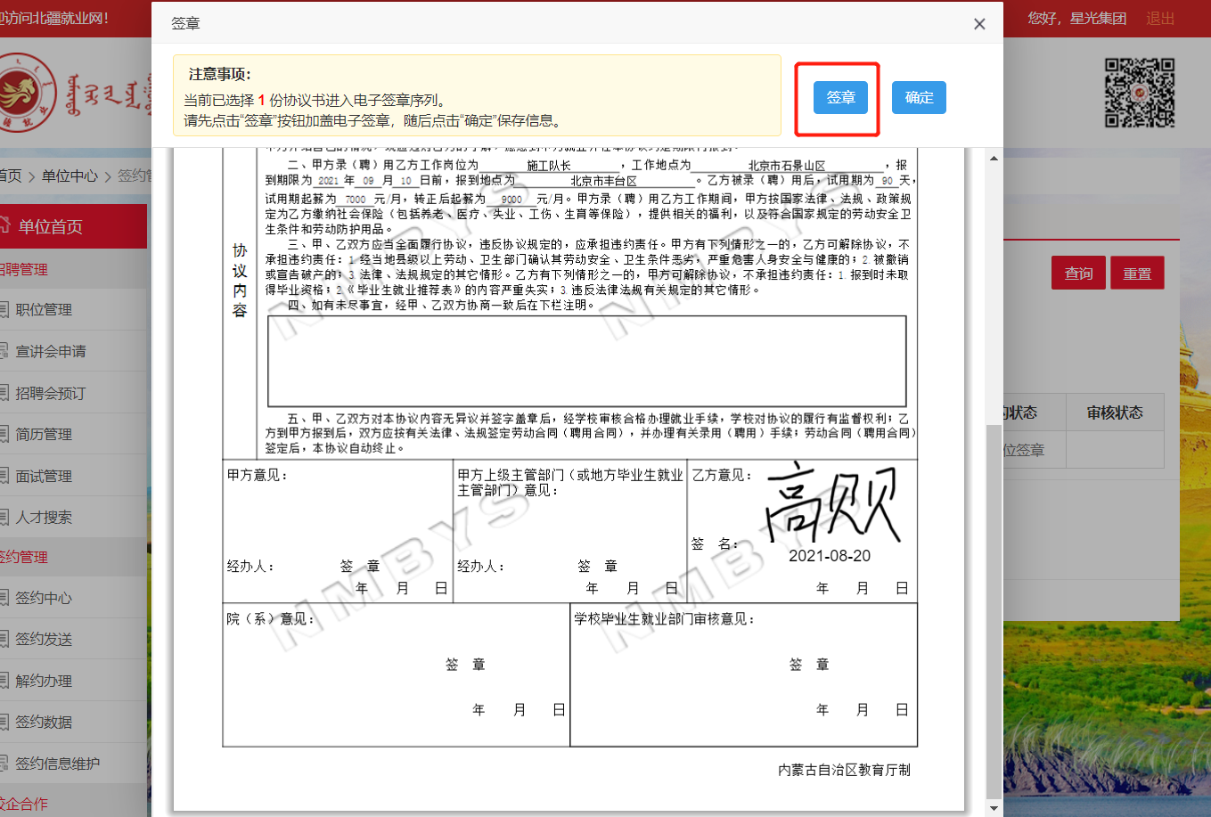 ① 员工同意签约。则签约信息流转回单位,管理员需在电子协议书上加盖电子签章(见下文)。