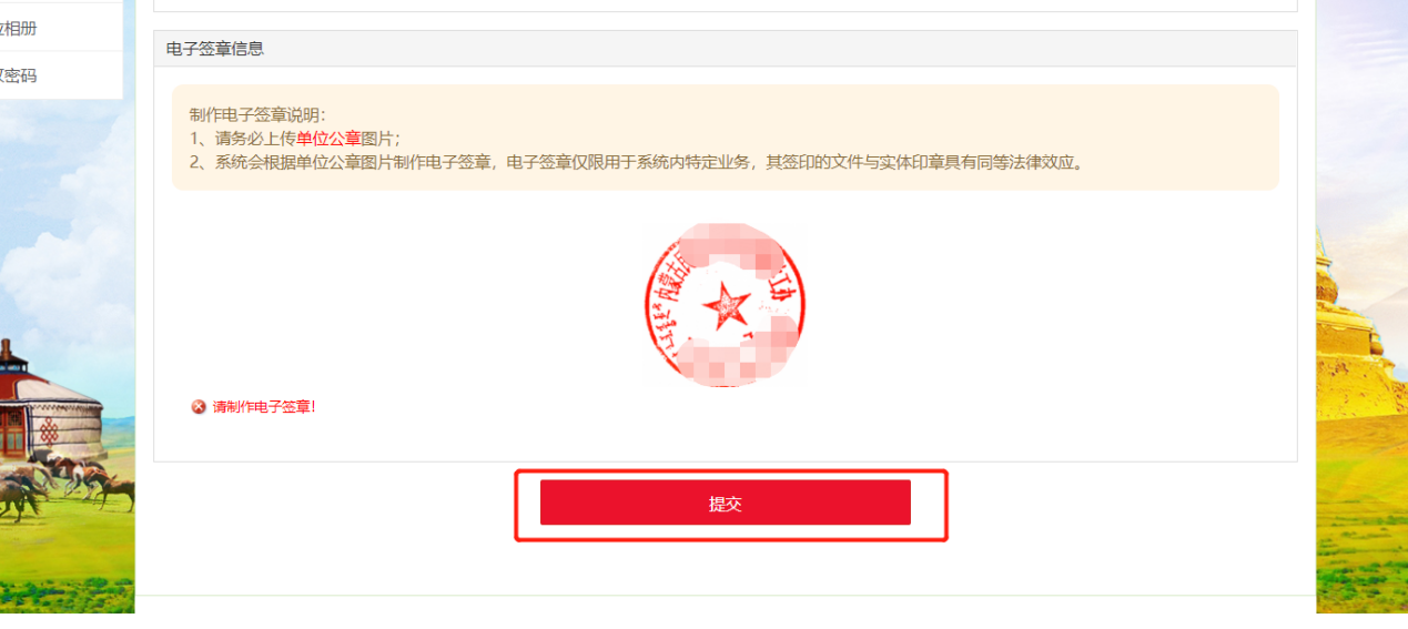 第一步:签约信息确认后点击左侧“签约信息维护”菜单,点击“制作电子章”,在信息提示框里仔细阅读相关提示和协议后勾选同意协议,点击现在制作: