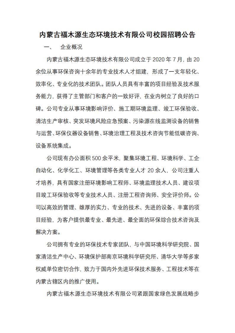 内蒙古福木源生态环境技术有限公司校园招聘公告